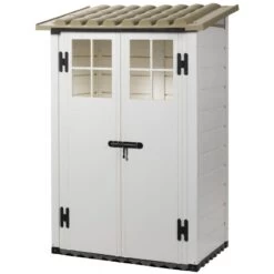 Les parois se composent de lames de PVC alvéolées de 22mm d’épaisseur, résistantes, isolantes et faciles à monter. Elles s’empilent en toute simplicité, et le toit ABS traité anti-UV à 2 pentes, avec reliefs imitation tuiles de coloris taupe, se fixe sur des trous pré-percés de la structure en résine de PVC. Cette structure est garantie 5 ans. L’abri, fabriqué en Italie, ne nécessite aucun entretien particulier, la visserie galvanisée pour l’assemblage est fournie.