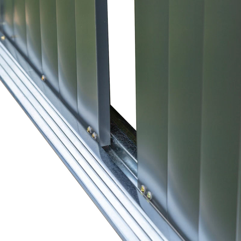 Ces panneaux qui constituent les parois et la toiture ne nécessitent aucun entretien, et leur coloris gris anthracite s’intègrera discrètement et harmonieusement dans tout type d’aménagement extérieur. L’abri dispose d’une très large double porte coulissante, qui parcourt toute la façade, très pratique pour le transport d’objets volumineux, et la porte est verrouillable (cadenas non inclus). La toiture peut supporter une charge de neige de 100kg/m², sa construction à double pente garantit une évacuation efficace de l’eau vers l’arrière de l’abri et facilite le déblayage de la neige.