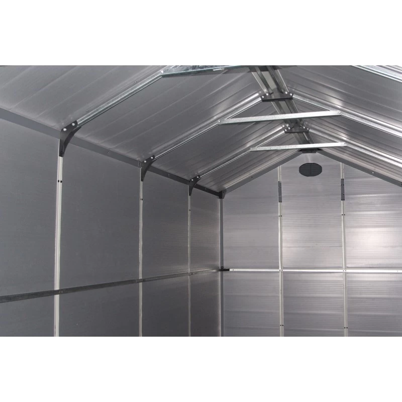 Cet abri conviendra idéalement pour entreposer du bois de chauffage, pour le rangement de votre outillage de jardin, comme atelier d’appoint ou comme garage pour des véhicules légers. Les profilés de renforts de la double barre faîtière et la ferme surélevée de la toiture dégagent une hauteur centrale appréciable, qui permet le stockage d’objets encombrants, échelle, tuteurs pour tomates et autres. De nombreux éléments de renfort assurent une rigidité structurelle optimale, notamment en soutien de la ferme de la toiture au niveau des jonctions des panneaux des parois.