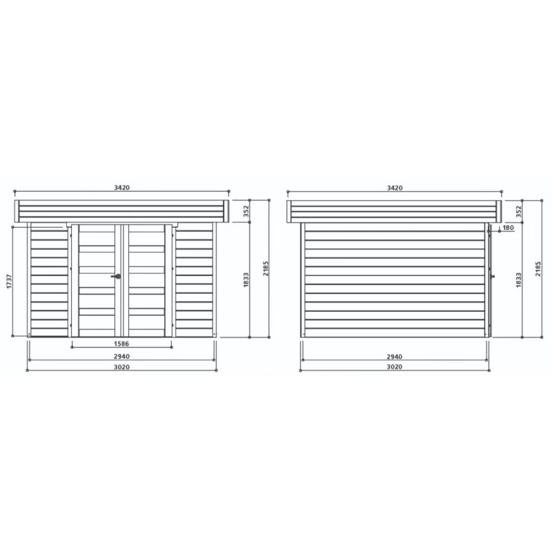 Le toit plat se compose de voliges de 16mm d’épaisseur avec une couverture en feutre bitumeux qui protégera temporairement votre abri et ce qu’il contient. Il est fortement conseillé de recouvrir votre abri de jardin par une couverture de toit spécifique toits plats de votre choix. Il supporte une charge de neige maximale de 75kg/m². L’abri de jardin est livré sans plancher, et doit être installé sur une dalle de béton de 3x3m.
