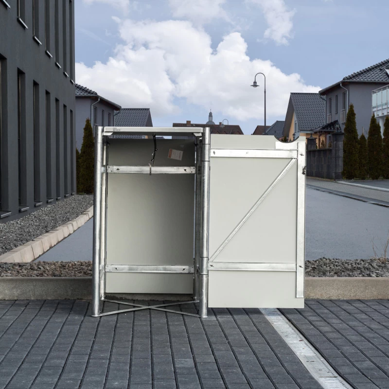 Les cache-poubelles Hide sont prévus pour une utilisation en extérieur. Ce modèle est doté d’un cadre en acier galvanisé à chaud et les parois sont en aluminium composite de couleur grise. Les matériaux sélectionnés lui assurent une très grande durabilité, une résistance exceptionnelle face aux intempéries et ne demandent aucun entretien spécifique.