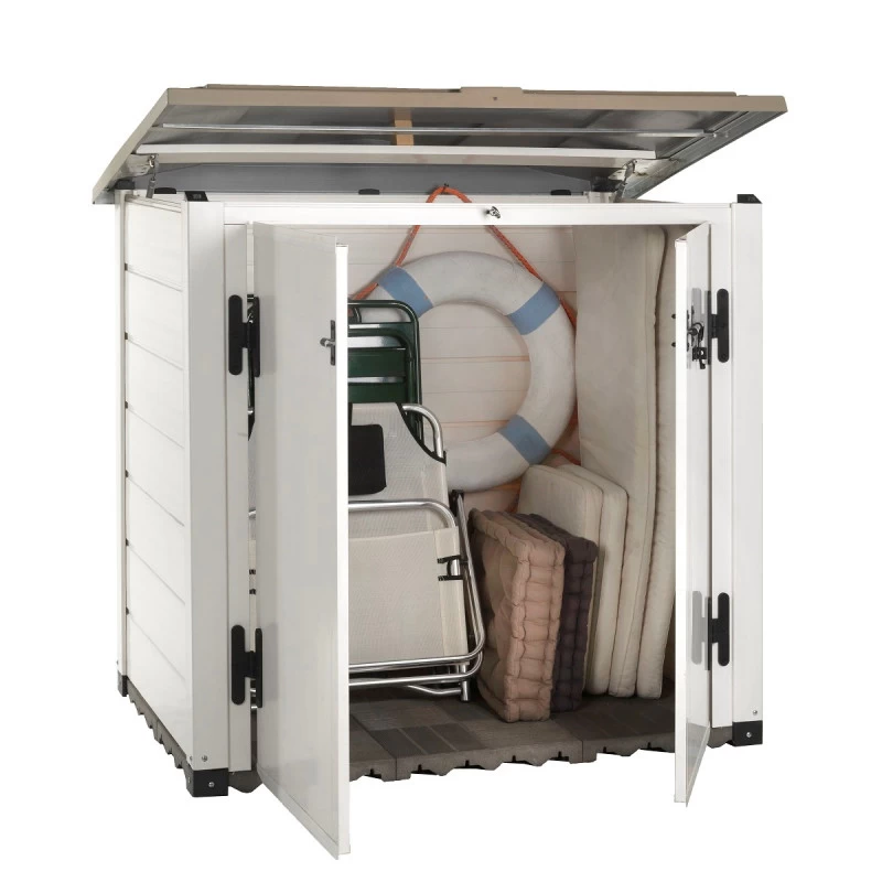 Idéal pour le rangement de conteneurs à déchets, pour des vélos, pour les outils de jardinage ou pour y dissimuler le matériel de filtrage de la piscine. Les cloisons épaisses de 22mm en PVC alvéolaire atténuent le bruit, et isolent des intempéries. Elles sont traitées anti-UV, ne craignent ni moisissure, ni insectes, et gardent un bel aspect durablement. L’entretien du coffre de jardin Garofalo consiste à un lavage avec une solution détergente légère, suivi d’un rinçage à l’eau froide.